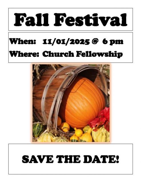 - Church Social Fall Festival, Saturday night (11/1) @ 6 pm in the church fellowship hall Participate in the contests, Join in relay races, and eat fun food! Watch for more info each week.